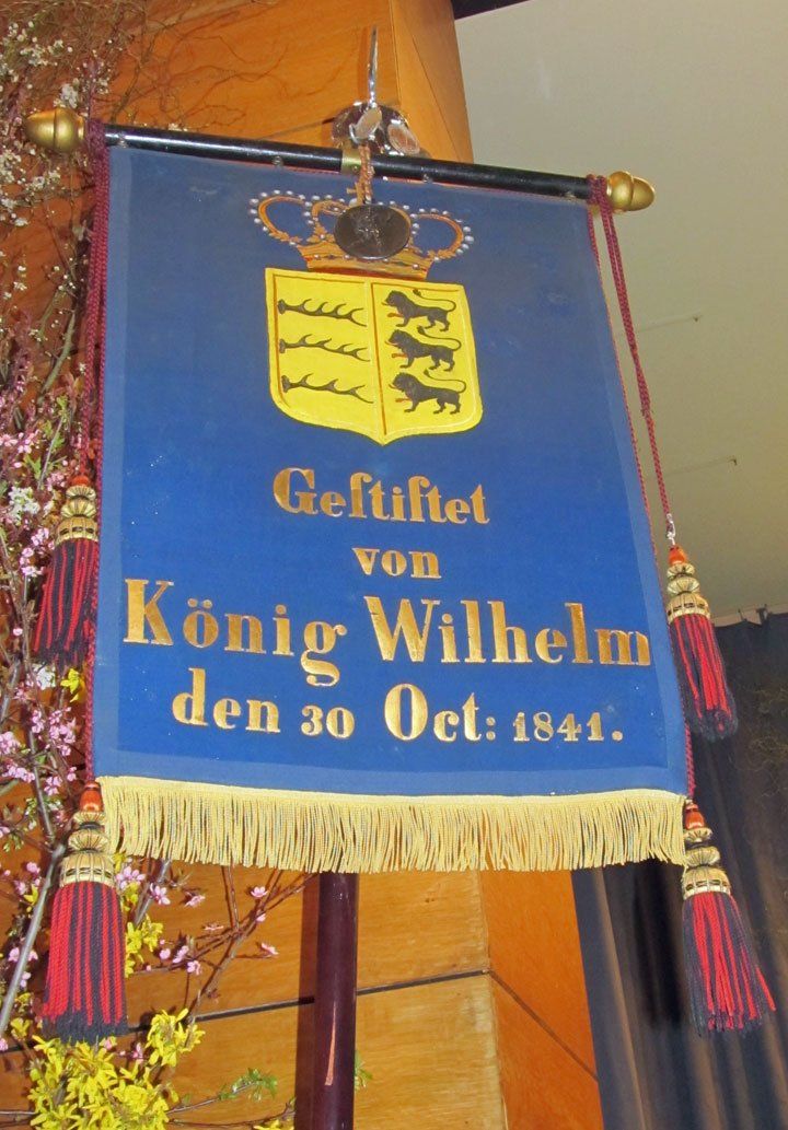 Im Jahre 1840 beteiligte sich der Verein an einem Sängerfest in Heilbronn. Dorthin fuhren sie mit einem Wagen, der von vier Rossen gezogen wurde. Mit dem Marschlied "Frühling schmückt die Brust der Erde" marschierten sie, alle bekleidet mit weißen Hosen, durch die Stadt. Auf dem Balkon des Heilbronner Rathauses sahs König Wilhelm der Erste. Auf den Gesang der Horrheimer aufmerksam geworden, ließ er die Gruppe anhalten und fragte nach, warum der Verein keine Fahne habe. Auf dem Festplatz angekommen, sang der Verein "Unsere Wiesen grünen wieder". Nach diesem Vortrag versprach der König dem Verein eine Fahne zu stiften, die er am 30. Oktober 1841 überreichen ließ. Leider musste der Verein im Revolutionsjahr 1848 die schweren silbernen Quasten und Ehrenkranz verkaufen.